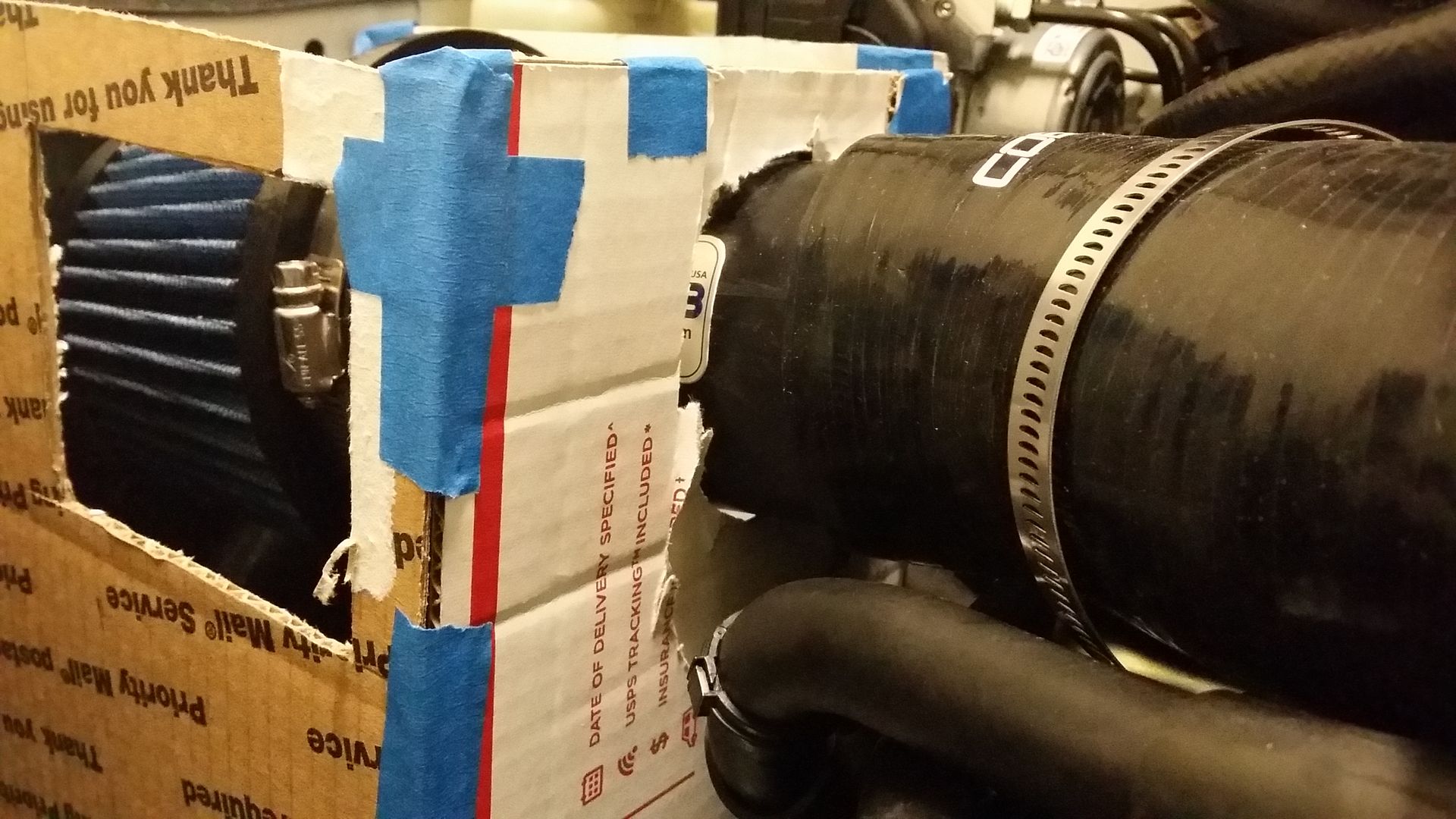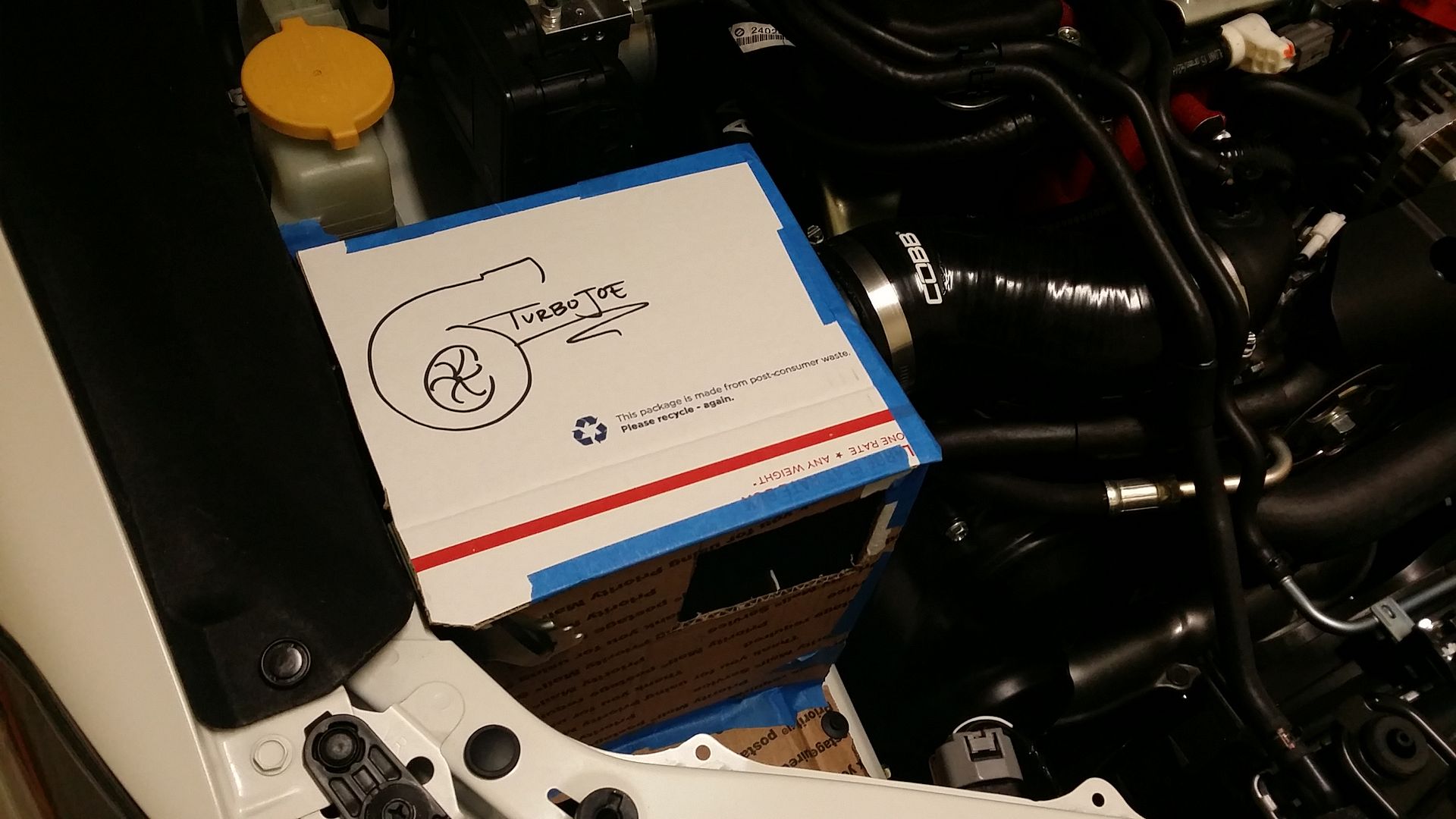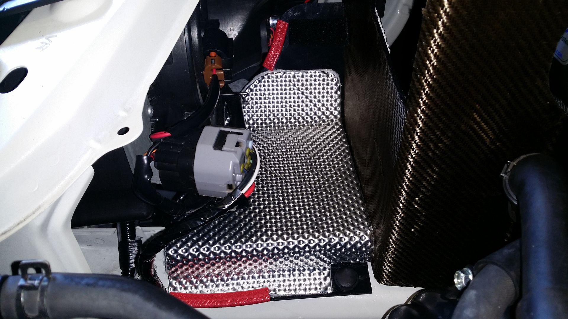 Let's reflect. First off, the front intake snorkus or scoop located under the hood, sits on top of the blazing hot radiator. From there, the already hot air is fed into the airbox where it passes through the MAF sensor, which then enters the intake elbow that is heated again by two more radiator hoses clipped on top of it. Continuing on, the air is sucked into the turbo via the turbo inlet. The air is compressed in the turbo's compressor housing, become more hot before entering the "omghot" TMIC that is massively heat soaked by turbo's hot section. All of this, combined with hot climate ambients and/or sitting in traffic can lead to heat soak until the car is in motion. But getting the car in motion only helps so much. We need to add some heat insulation to the first thing the air passes through.