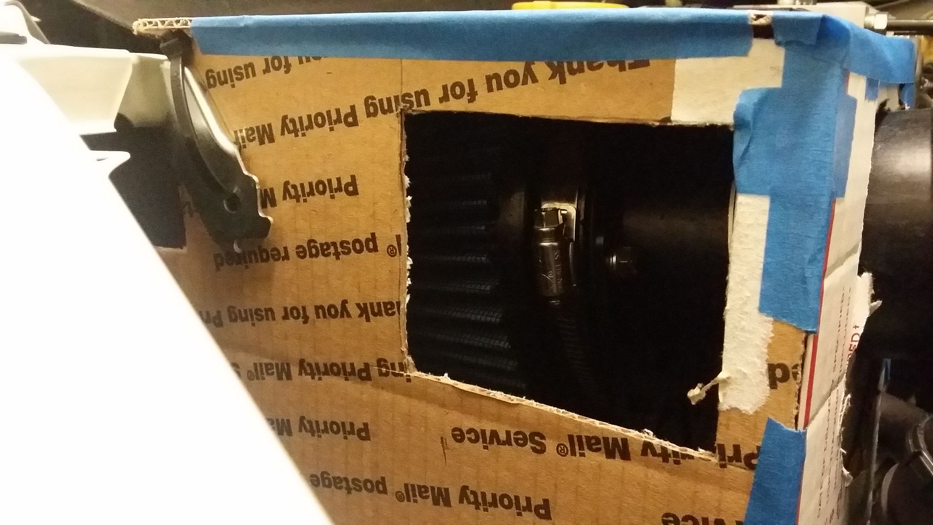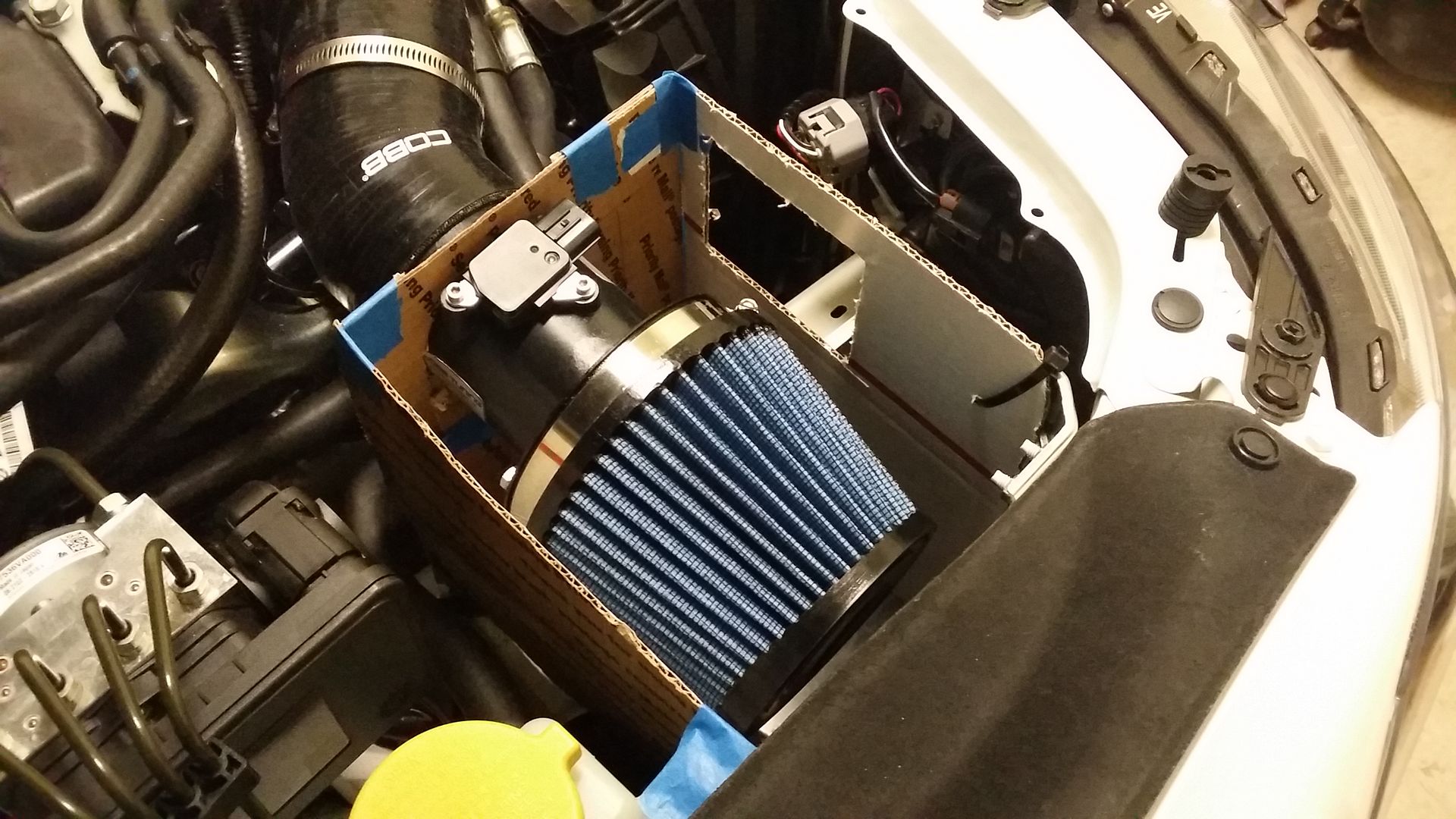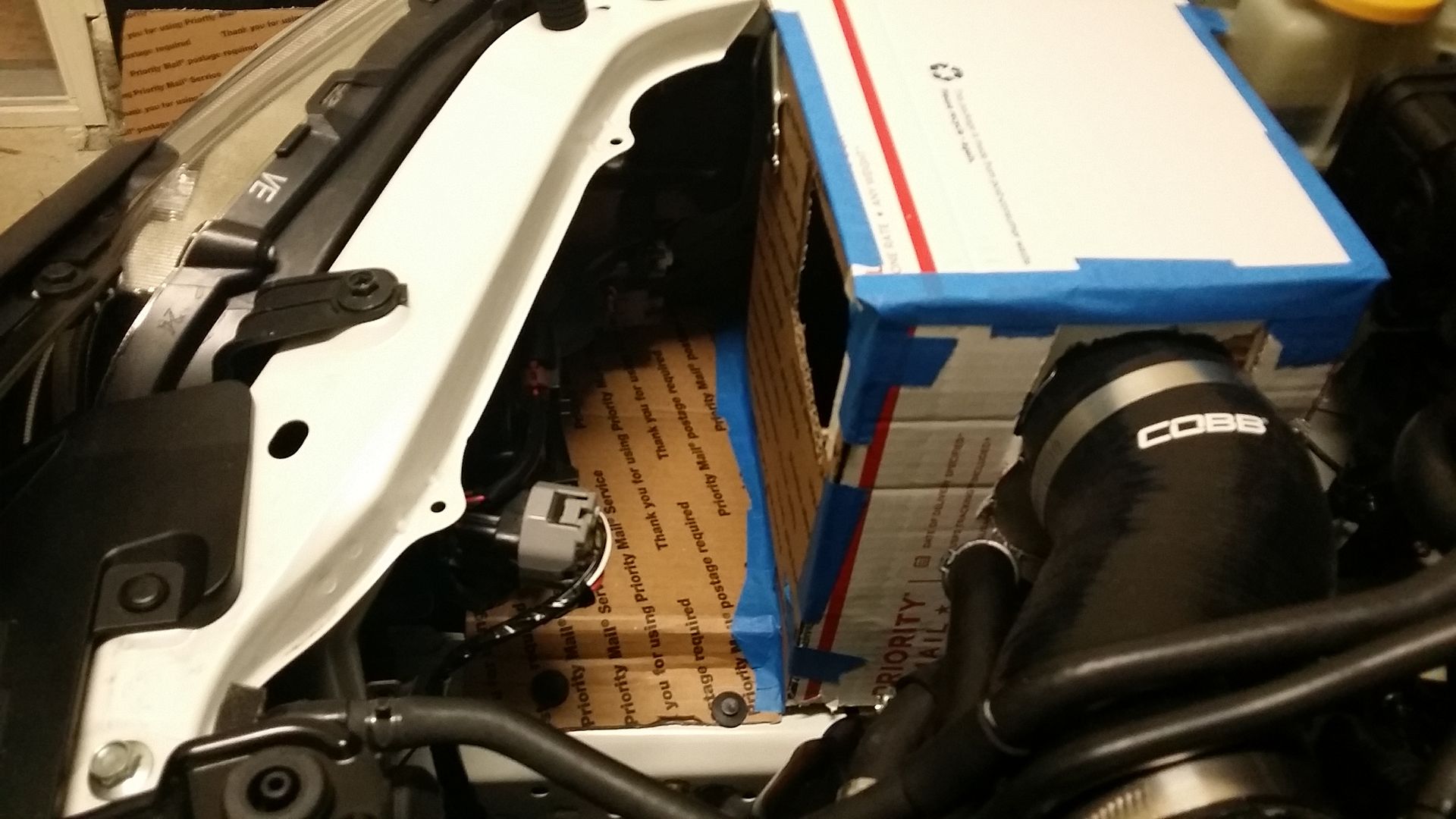 Let's reflect. First off, the front intake snorkus or scoop located under the hood, sits on top of the blazing hot radiator. From there, the already hot air is fed into the airbox where it passes through the MAF sensor, which then enters the intake elbow that is heated again by two more radiator hoses clipped on top of it. Continuing on, the air is sucked into the turbo via the turbo inlet. The air is compressed in the turbo's compressor housing, become more hot before entering the "omghot" TMIC that is massively heat soaked by turbo's hot section. All of this, combined with hot climate ambients and/or sitting in traffic can lead to heat soak until the car is in motion. But getting the car in motion only helps so much. We need to add some heat insulation to the first thing the air passes through.